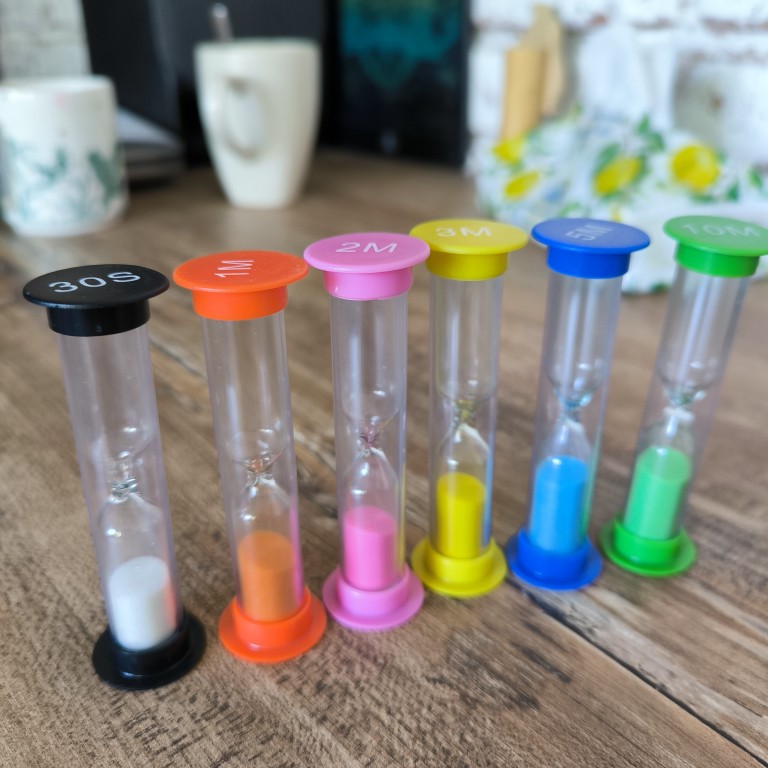 Conjunto com 6 ampulhetas coloridas, cada uma com um tempo diferente: